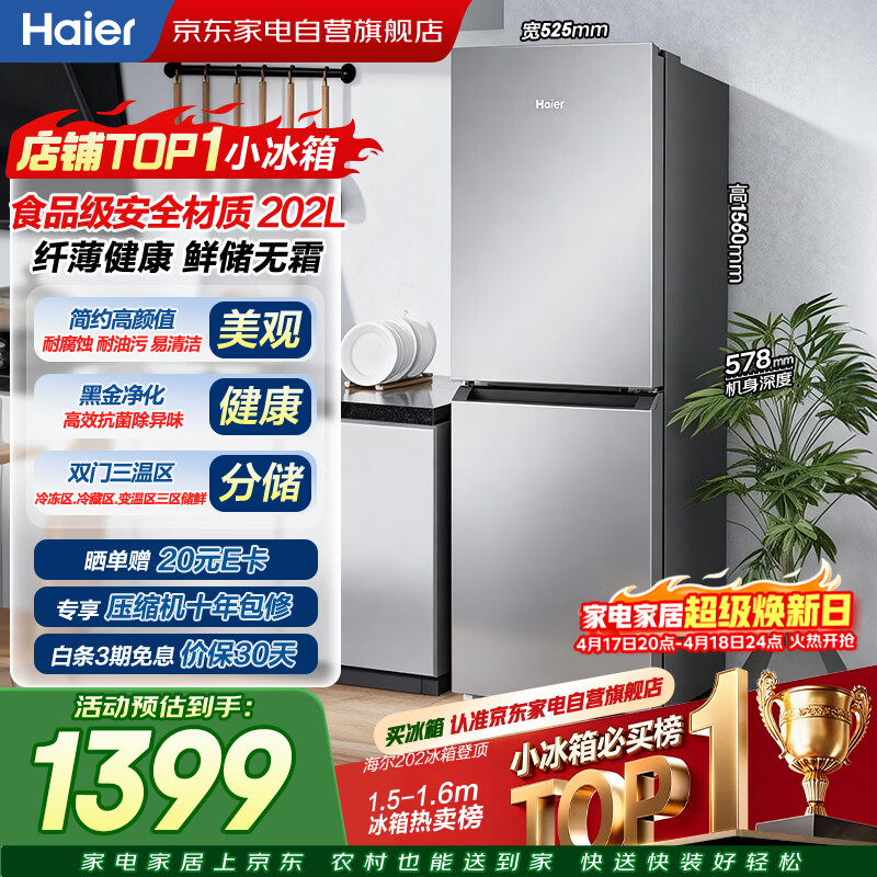 海尔冰箱202升双门两门食品级材质黑金净化抗菌三温区风冷无霜小型家用租房BCD-202WGHC290S9以旧换新