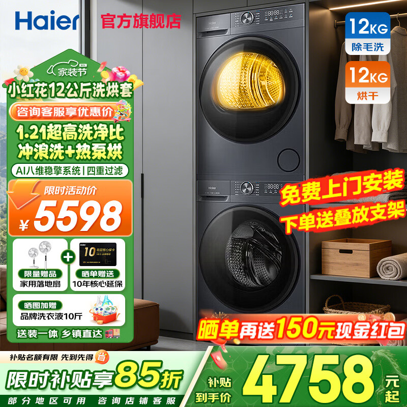 海尔云溪4.0洗烘套装77EW/37E/53E/67E/582/52D1洗衣机烘干机洗干套装10公斤/13公斤/12公斤 【超级新品】丨12KG洗涤+12KG热泵烘+空气洗
