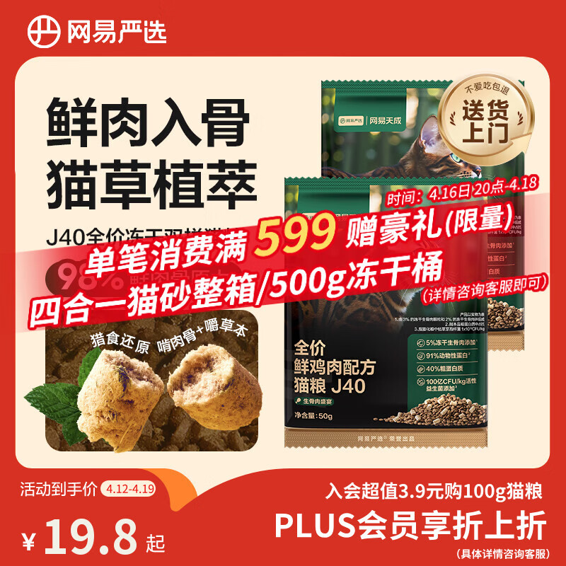网易严选全价鲜鸡肉猫粮J40生骨肉主食冻干双拼成幼猫护肠胃50g*2试吃试用