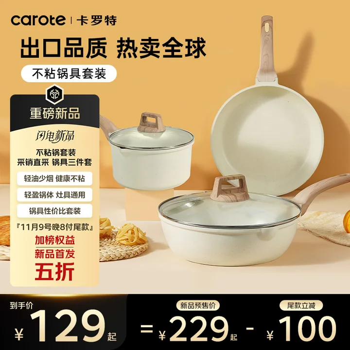 卡罗特锅具套装不粘锅麦饭石全套家用电燃通用厨具煎锅炒锅奶锅三件套
