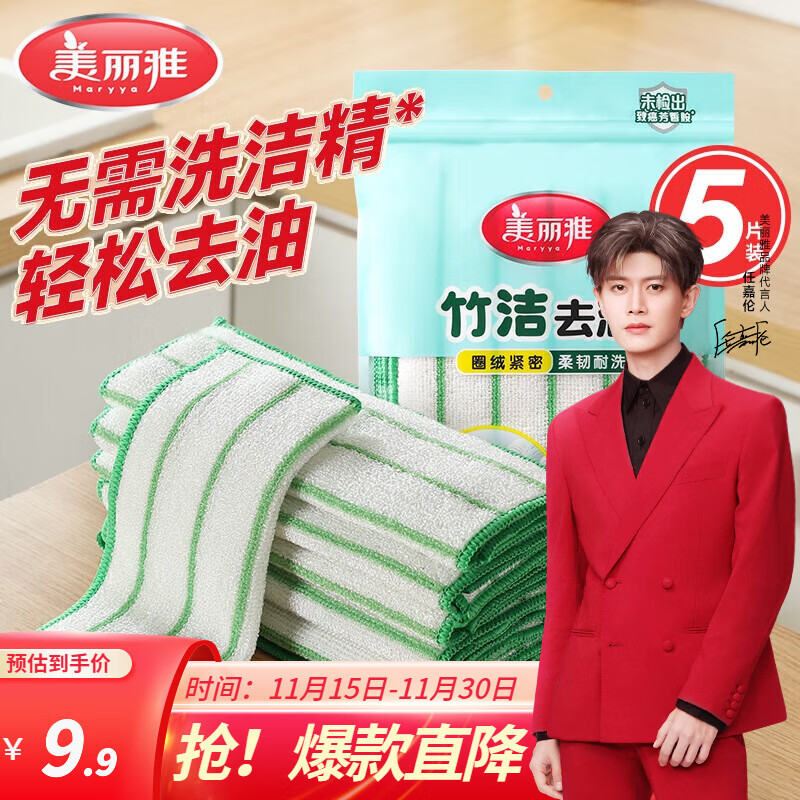 美丽雅(MARYYA)竹纤维抹布洗碗布不易粘油洗碗刷锅百洁布清洁去油厨房用品 去油抹布5片(23*18cm)