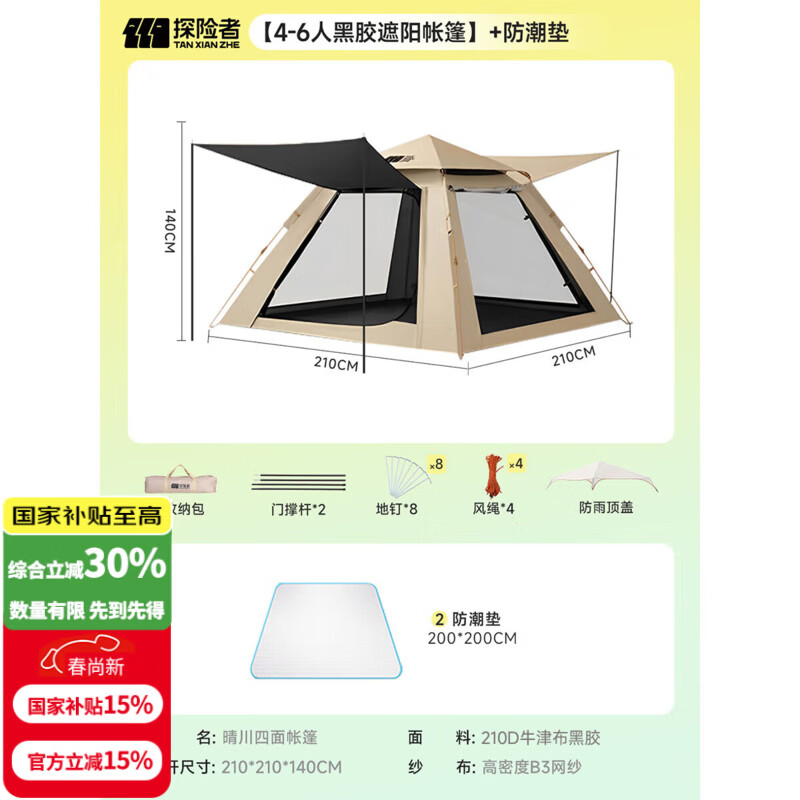 探险者(TAN XIAN ZHE)帐篷户外露营防雨过夜3人-4人速开便捷天幕二合一黑胶防晒帐篷 【4-6人黑胶遮阳帐篷】+防潮垫