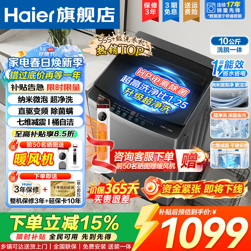 海尔(Haier)12公斤洗衣机全自动大容量家用波轮【落地窗帘可洗】自编程强力洗双侧仿生过滤器以旧换新统帅 新品10KG直驱+七维减震+纳米微净泡 波轮