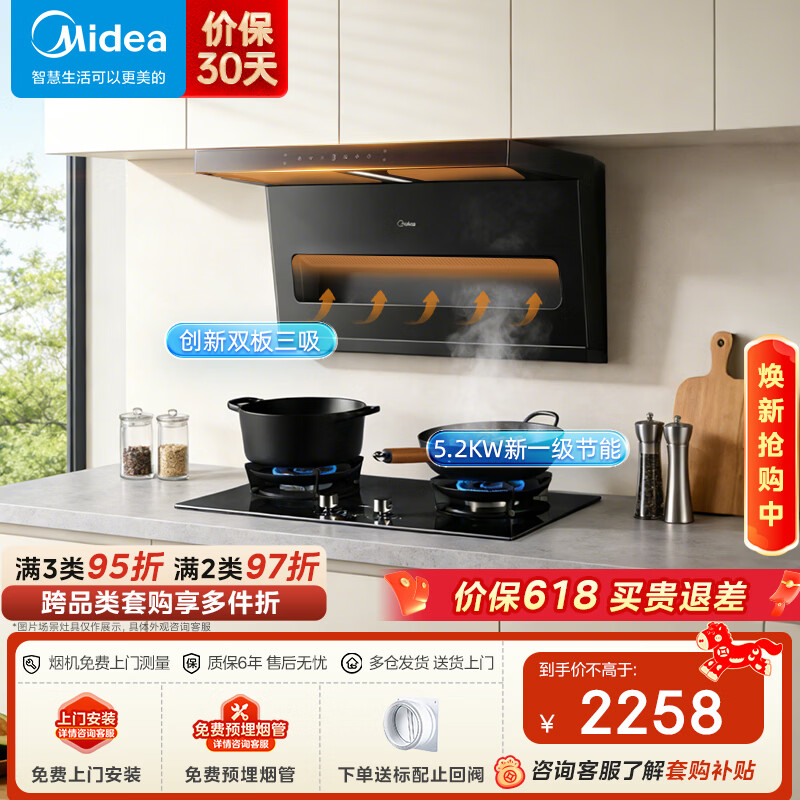 美的(Midea)顶侧三吸油烟机 23立方爆炒大吸力 7字型烟机自动清洗挥手智控家用抽油烟机炉灶燃气灶套装DP55 【烟灶套装】搭配5.2KW节能灶A3(天然气)