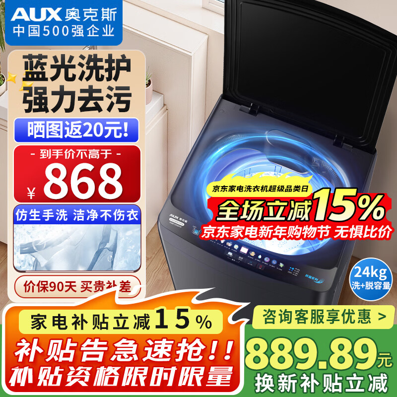 奥克斯(AUX)波轮洗衣机全自动 大容量洗衣机家用宿舍租房神器 【国补】 深黑色24KG洗脱容量/智能风干【蓝光抑菌】 波轮