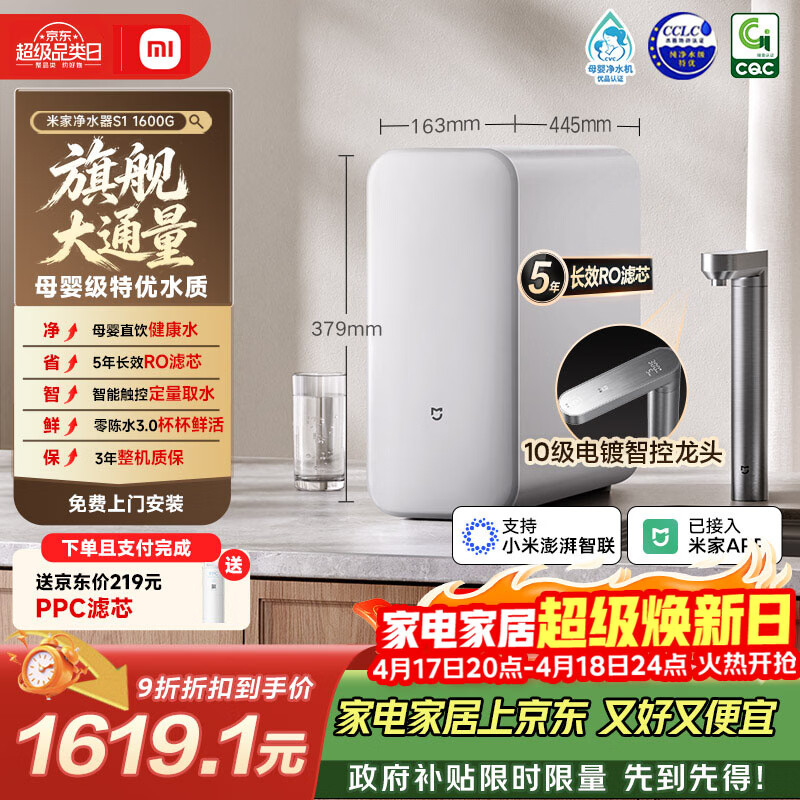 米家小米厨下净水器S1 1600G 5年长效RO 母婴特优水质 智能家用大通量厨房专用台下用净水机MR1672-A