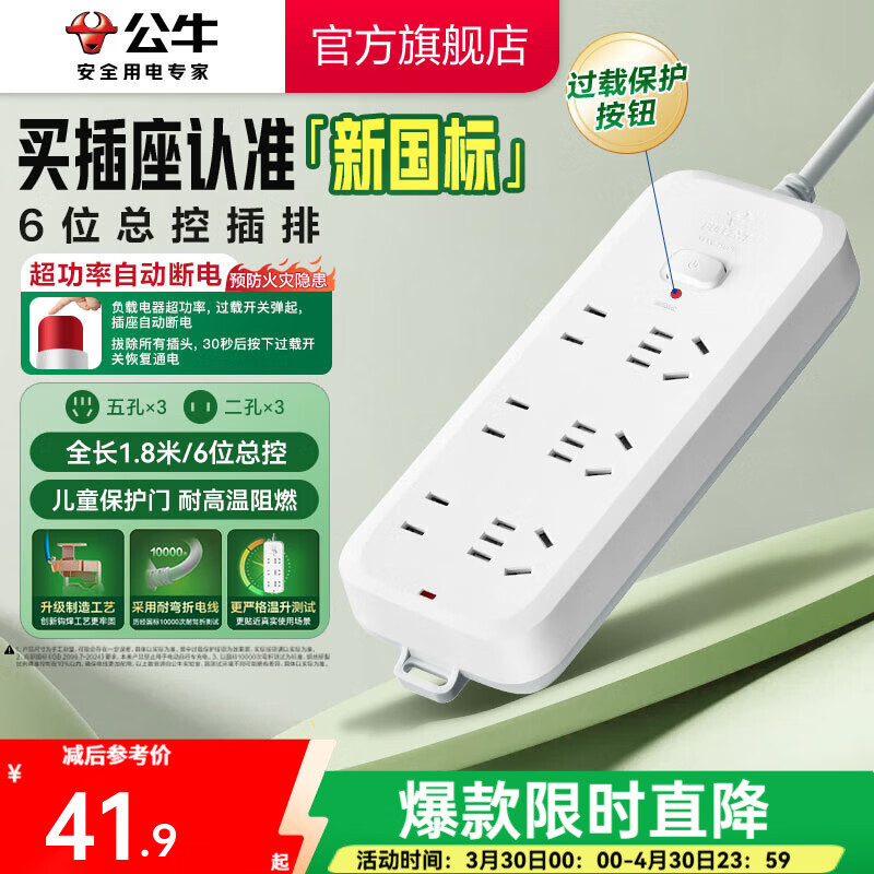 公牛(BULL) 插座/B5系列 带儿童保护门/新国标插座/排插 【6位】总控1.8米(新国标防过载)B5330
