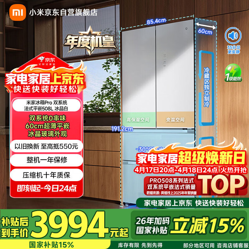 米家【年度机皇】小米Pro508L法式门冰箱一级变频双系统双循环超薄嵌入式零嵌BCD-508WFTGBI国家补贴