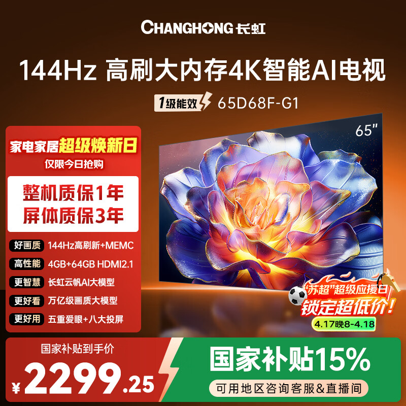 长虹品质款 长虹电视 65D68F-G1 65英寸 144Hz高刷 4GB+64GB大内存 4K超高清智能液晶平板电视国家补贴