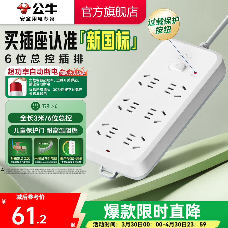 公牛(BULL) 插座/B5系列 带儿童保护门/新国标插座/排插 【6位】总控3米(新国标防过载)B5060
