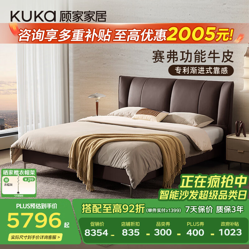 顾家家居主卧室双人牛皮床B029齐边款檀褐色赛弗皮1.8*2.0+撑腰·深睡1号