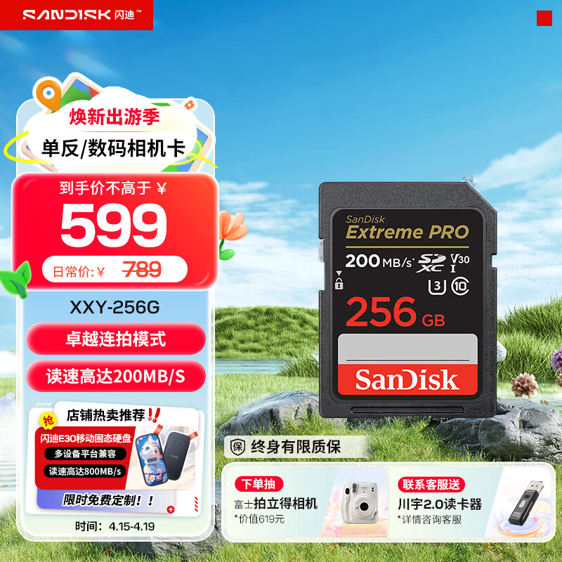 闪迪相机卡 4K高清SD卡 UHS-I微单存储卡微单反摄像储存大卡内存sd卡内存卡 256G SD卡【联系客服送一个7.9元川宇读卡器