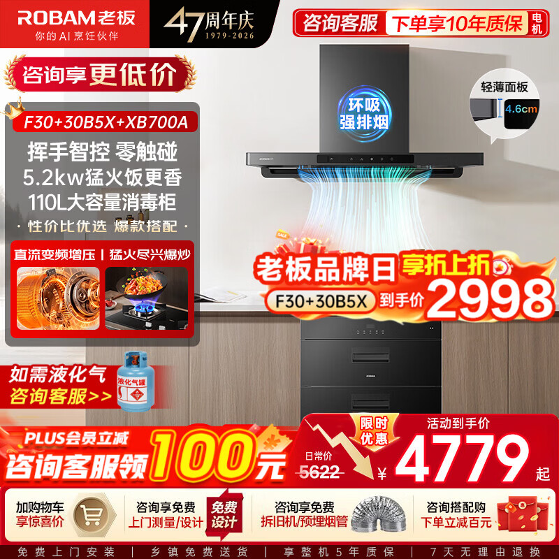 老板(Robam)【升级款F30】60A0S油烟机燃气灶套装 家用欧式顶吸抽油烟机灶具 直流变频巡航24大风量烟灶套装 【三件套】烟灶套装+110L消毒柜XB700A