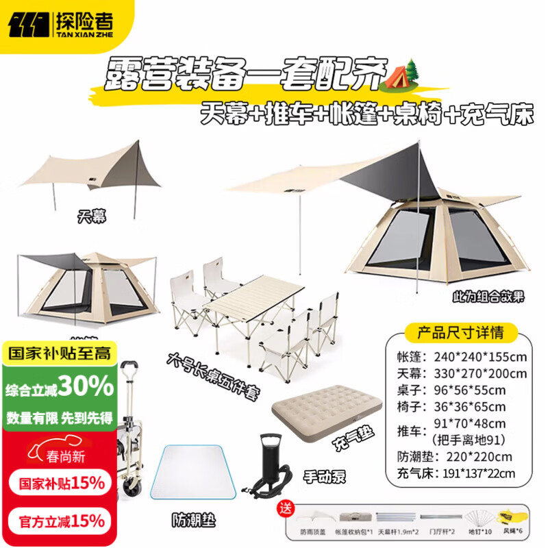 探险者(TAN XIAN ZHE)帐篷户外露营防雨过夜3人-4人速开便捷天幕二合一黑胶防晒帐篷 露营装备一套配齐【5-8人】
