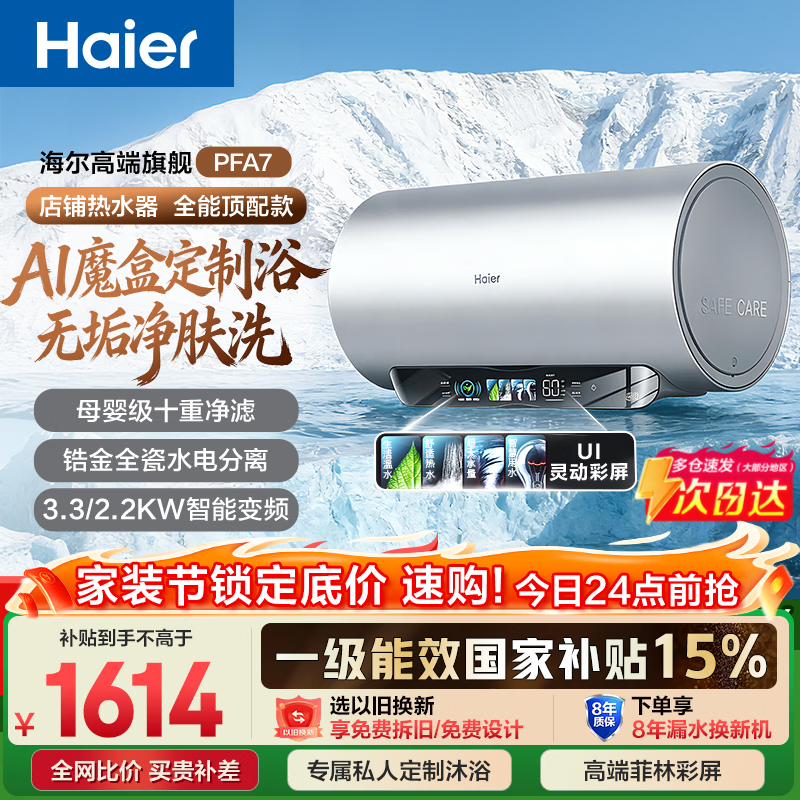 海尔(Haier)国家补贴 电热水器3300W变频速热 无垢鲜活水净水洗 内胆免洗镁棒免换一级能效无缝胆储水式 80L 3300W PFA7/鲜活净水/智慧屏