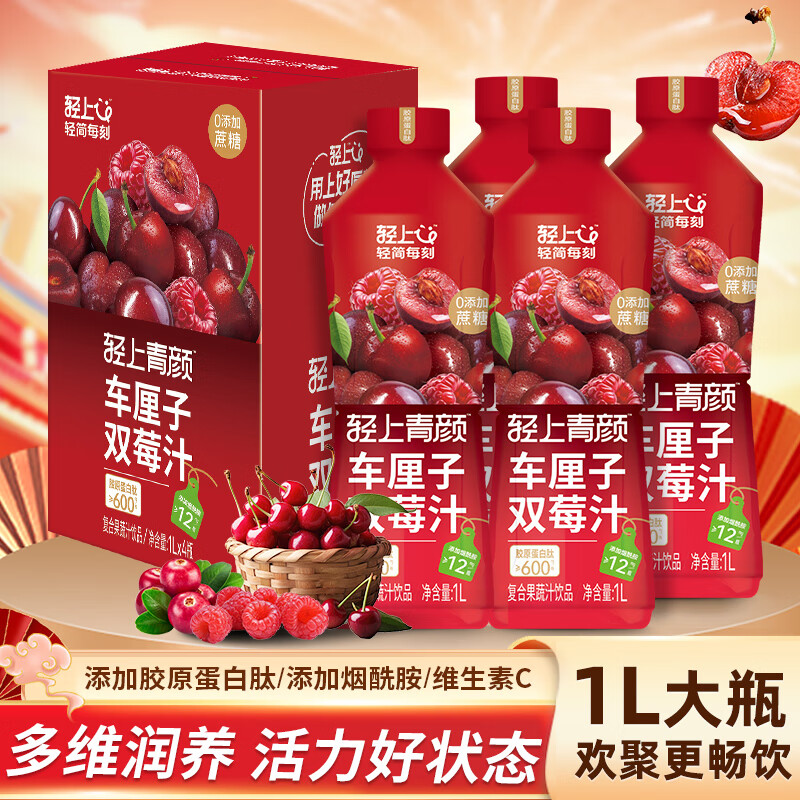 轻上【年货礼盒】轻上100%果汁含量苹果汁红富士苹果果汁饮品整箱装 车厘子双莓汁1L*4瓶