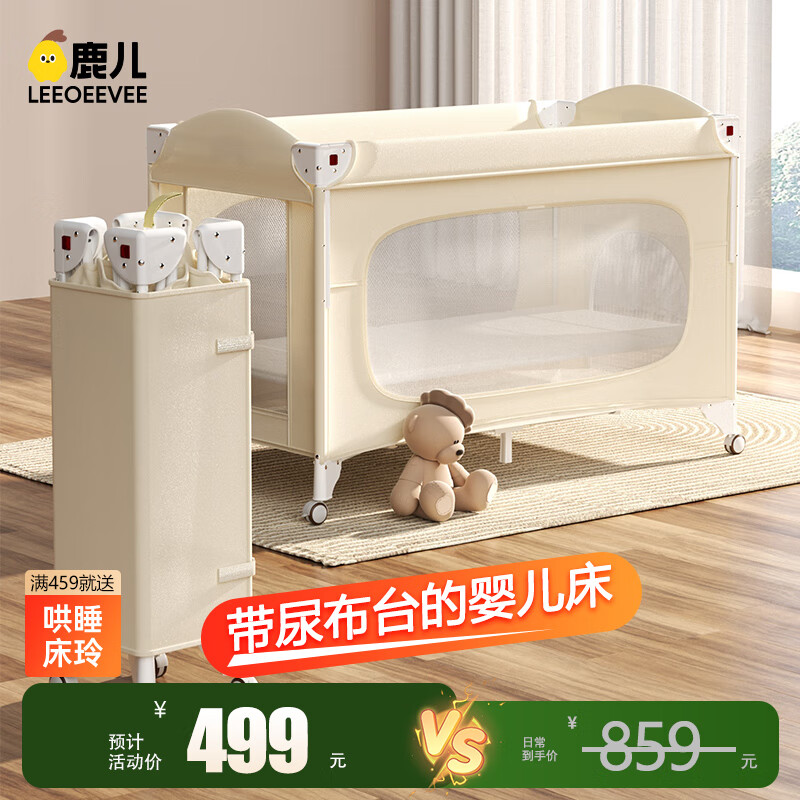 leeoeevee鹿儿婴儿床新生折叠拼接大床便携可移动bb宝宝床多功能小户型床 尿布台款【单床+固定带+尿布台】