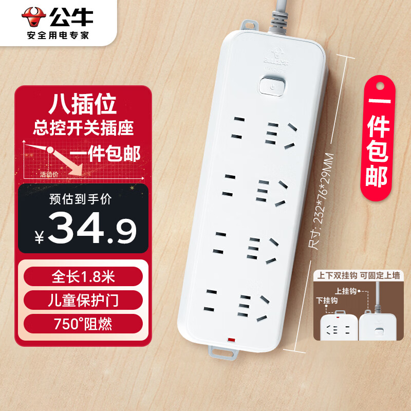 公牛(BULL)【一件包邮】插座/插线板/插排/排插/接线板/宿舍家用桌面拖线板 3C认证 8位总控开关1.8米
