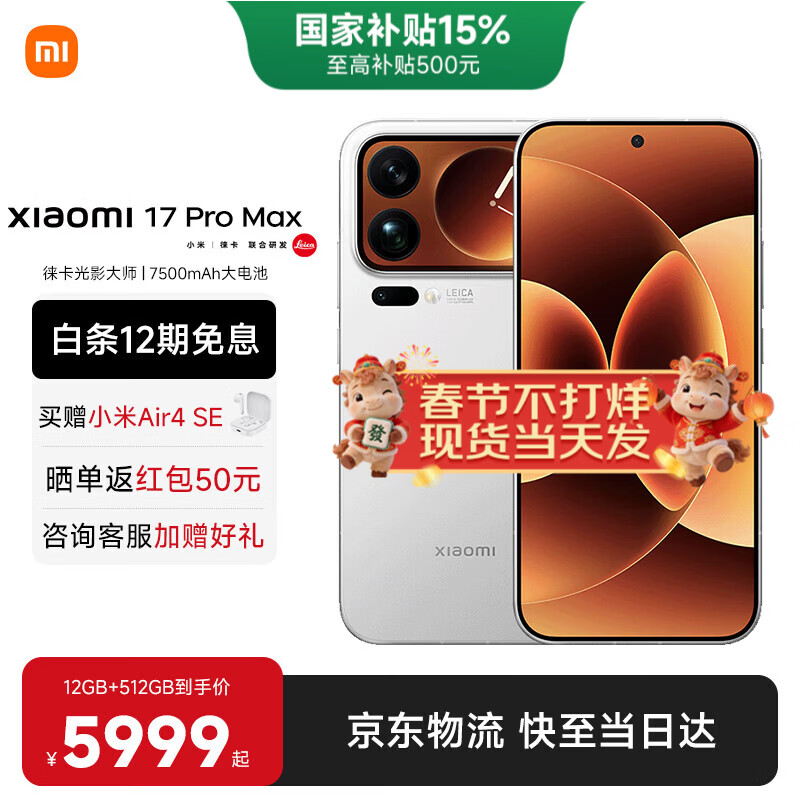 小米(MI)小米17promax 徕卡光影大师人像 第五代骁龙8至尊版 6.9英寸120Hz阳光屏 小米手机17promax 白色 16GB+512GB 【官方标配】
