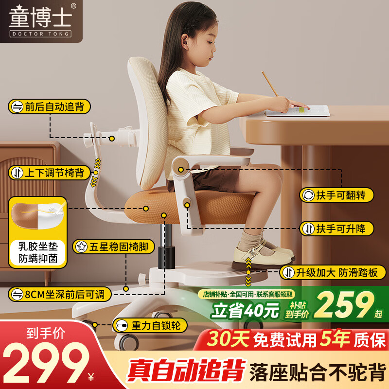 童博士儿童学习椅追背中小学生写作业写字椅子家用升降调节座椅追背椅G6 真追背8cm+一键追背+重力自锁咖