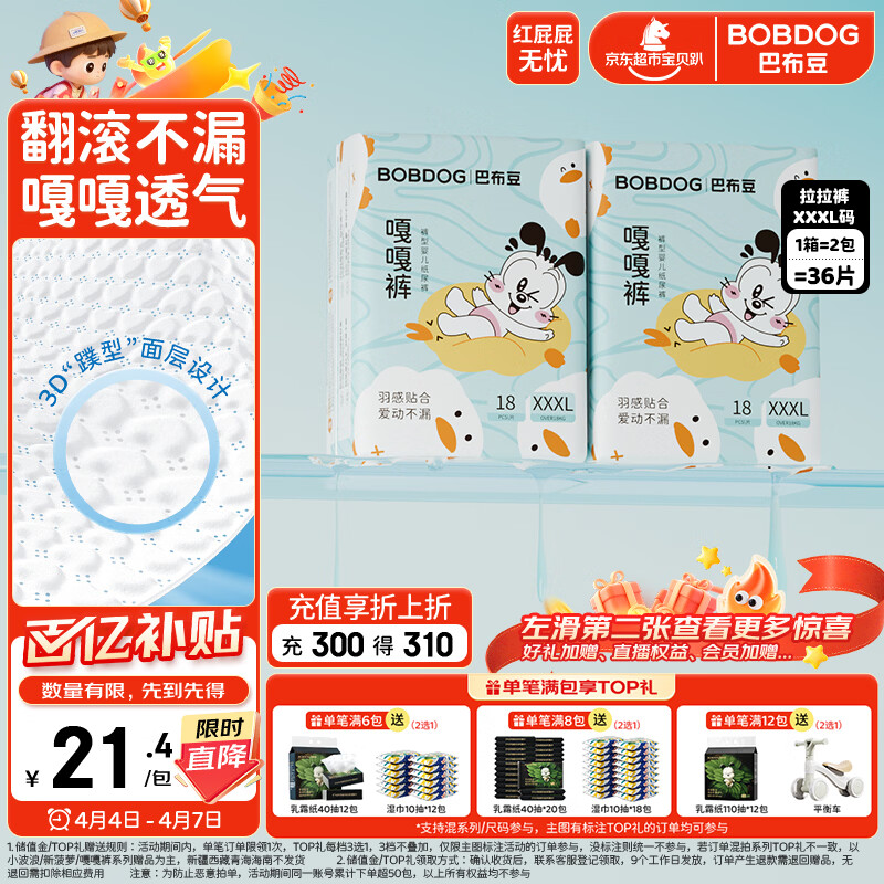 巴布豆(BOBDOG)嘎嘎裤拉拉裤XXXL36片(17-20KG)尿不湿 超薄透气 干爽