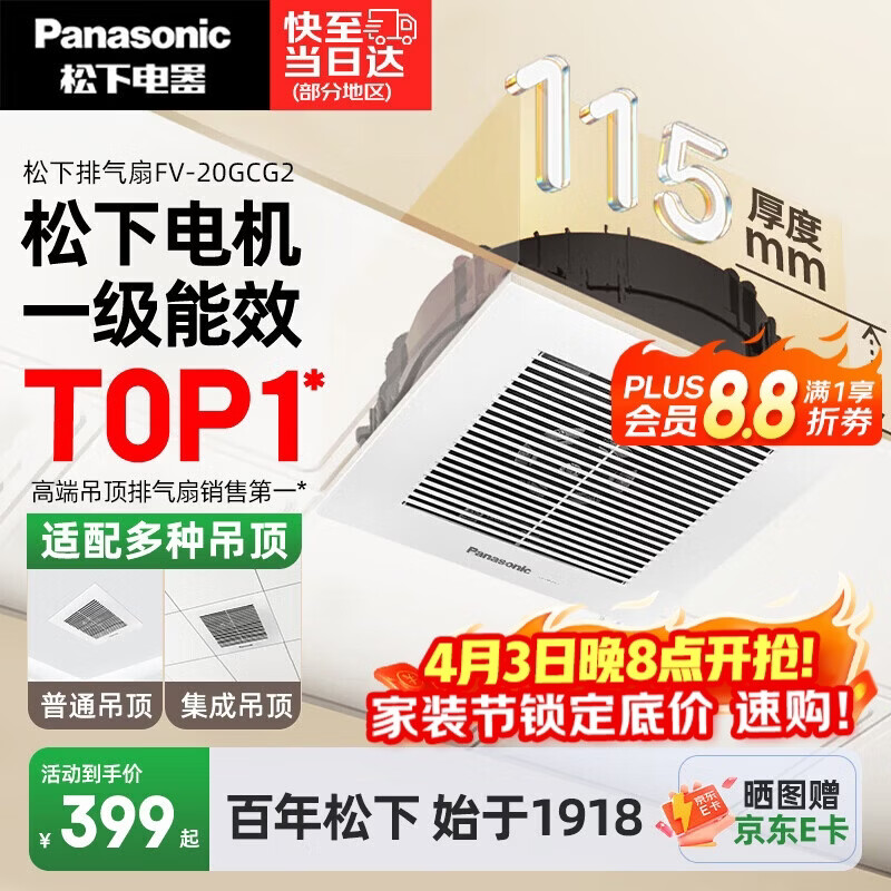 松下(Panasonic)排气扇吸顶式厨房强力抽风机卫生间吊顶换气扇排风扇FV-20GCG2