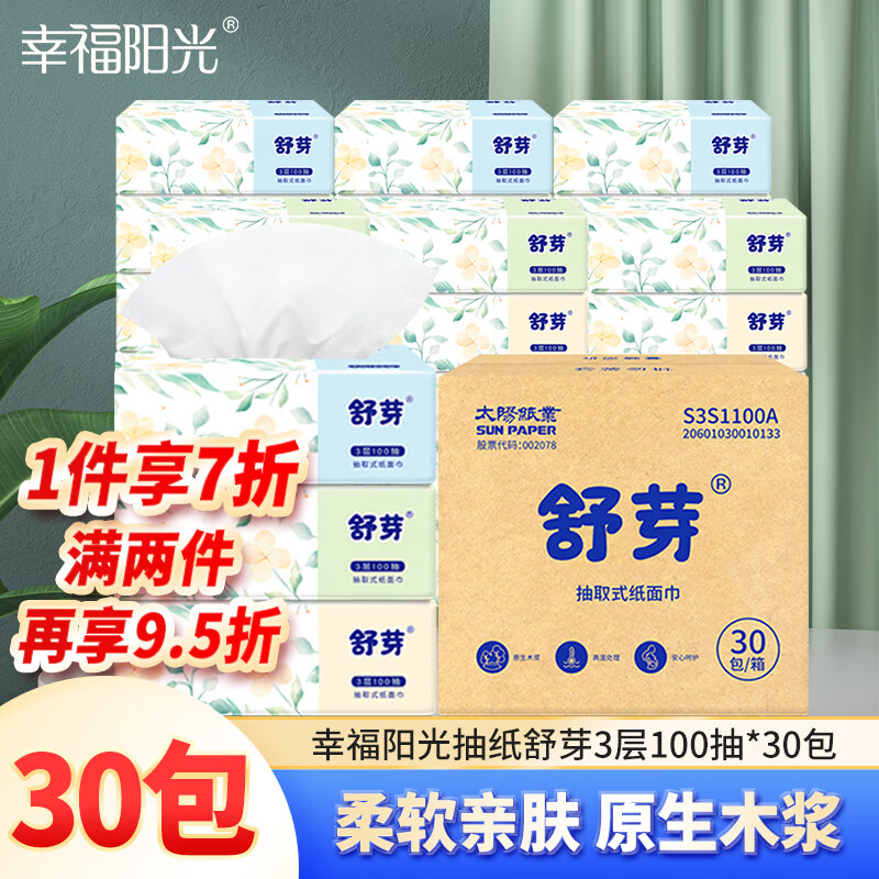 幸福阳光 抽纸 舒芽3层100抽*30包超值装 湿水不易破 柔软亲肤 包装升级
