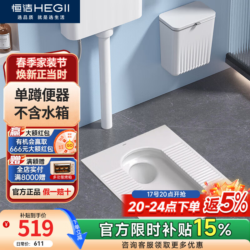 恒洁(HEGII)专利款蹲便器水箱套装超薄防溅防臭卫生间蹲便蹲坑蹲厕大便器3026 【专利侧弯排污】3032B-后进前排