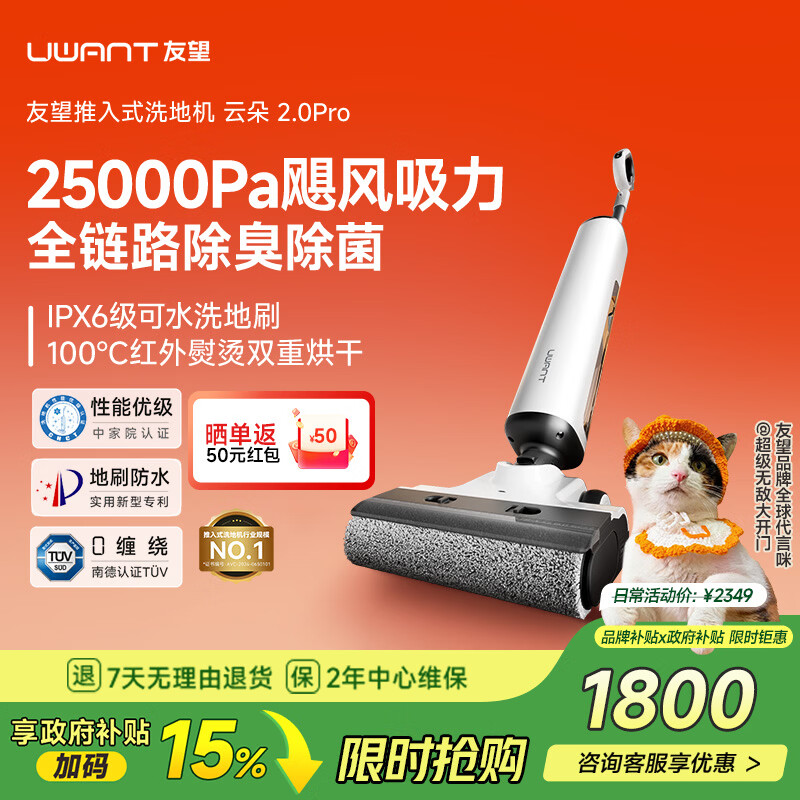 UWANT友望云朵2.0Pro洗地机【25kPa吸力 0缠毛超薄躺平】推入式洗拖吸一体自动清洗拖地机 云朵2.0pro白色【旗舰款】