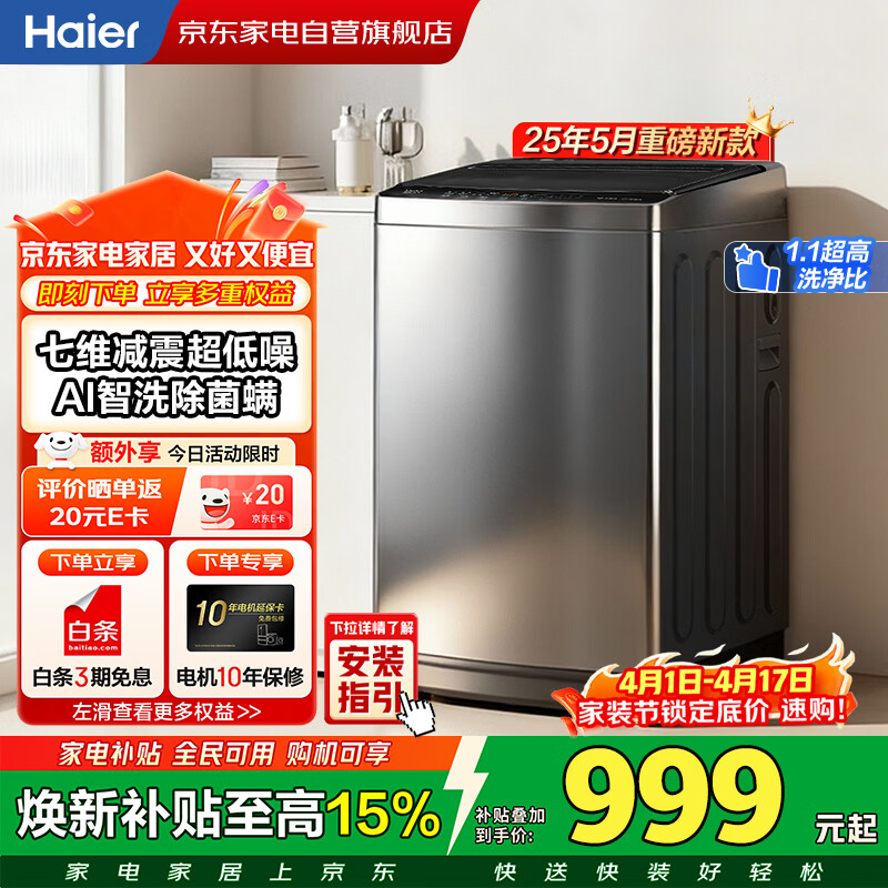 海尔波轮洗衣机全自动8KG家用 新品上市 直驱变频 一级能效 七维减震 一键智洗 除菌螨XQB80-BZ20X0