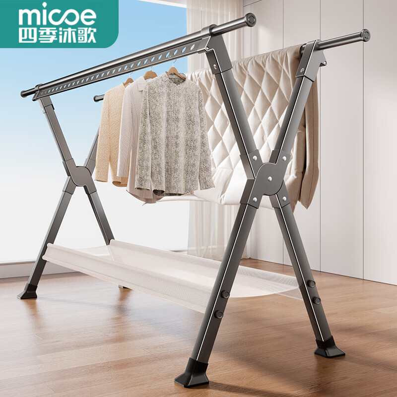 四季沐歌折叠晾衣架落地凉晒衣架铝合金家用晒被子阳台晾衣架晒衣架挂衣架 【铝合金款】可伸缩2.5m+晾晒网