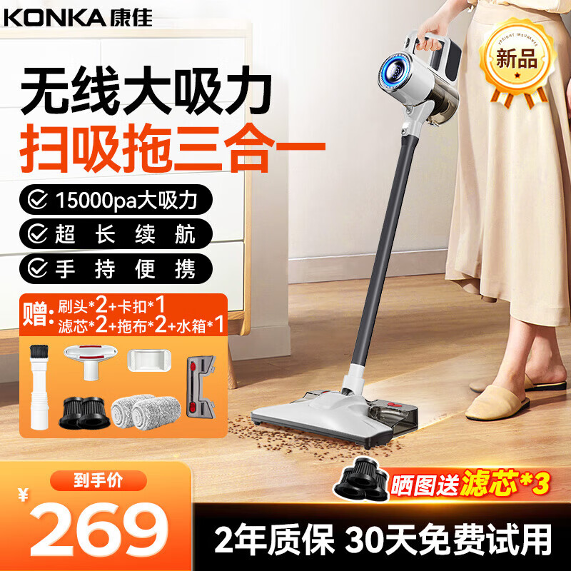 康佳吸尘器无线吸拖一体机家用大吸力手持小型轻音大功率洗地机-A 扫吸拖三合一+升级湿拖水箱丨灰色