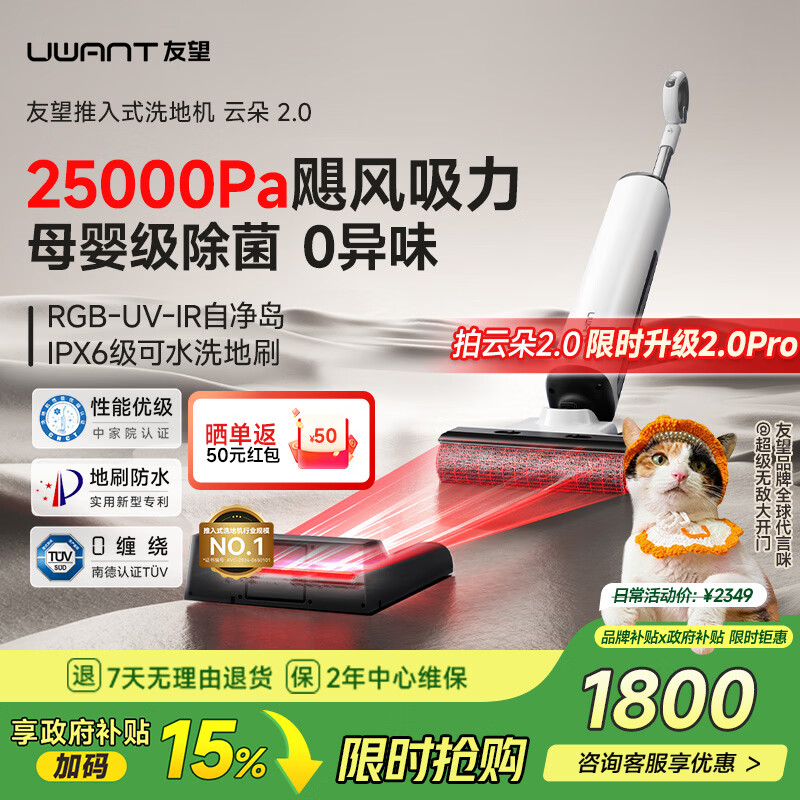 UWANT友望云朵2.0Pro洗地机【25kPa吸力 0缠毛超薄躺平】推入式洗拖吸一体自动清洗拖地机 云朵2.0【限时升级2.0Pro】
