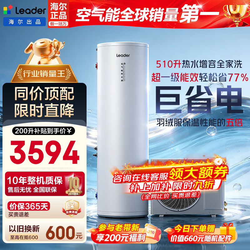 海尔(Haier)国家补贴空气能电热水器包安装 双变频一级节能200升/300升80℃家用商用统帅空气源电辅热泵热水器 MA7【200升性价比】超一级省电/大水量