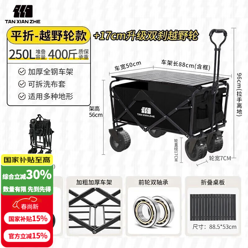 探险者(TAN XIAN ZHE)露营车儿童可躺户外推车野餐车露营装备折叠露营推车营地车买菜车 250L 曜石黑【双刹越野轮+桌板】