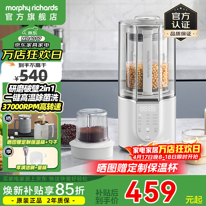 摩飞电器(Morphyrichards)柔音破壁机家用豆浆机轻音全自动1.5L大容量多功能料理机十重降噪自动清洗定时预约免滤无渣 【研磨双杯】MR4017椰奶白