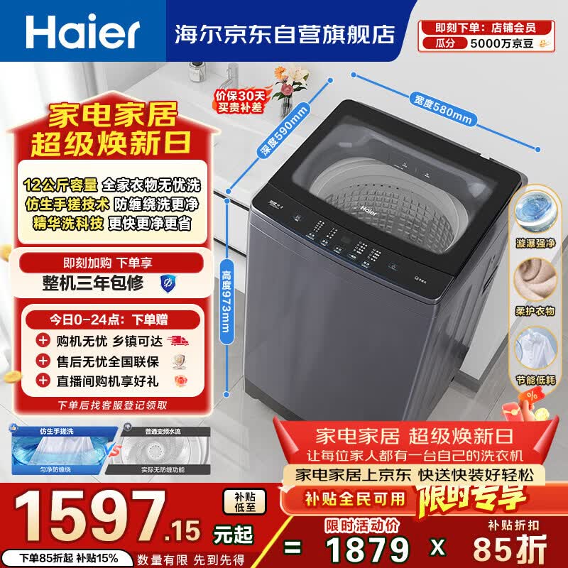 海尔(Haier)手搓洗 全自动波轮洗衣机 12KG大容量 直驱 防缠绕 国家补贴以旧换新京东自营 XQB120-BSE629