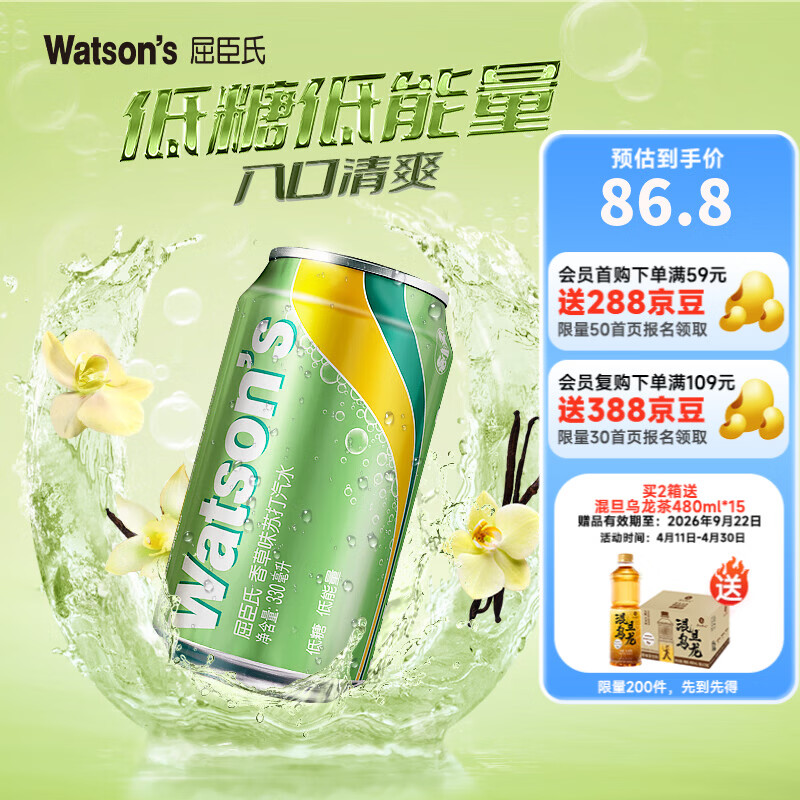 屈臣氏(Watsons)苏打汽水 气泡水 特调饮料 330ml*24罐 整箱装 聚会饮品 低糖0脂 香草口味