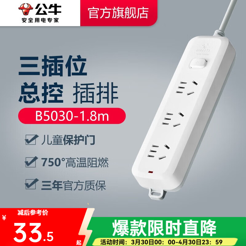 公牛(BULL) 插座/B5系列 带儿童保护门/新国标插座/排插 【3位】总控1.8米 GN-B5030