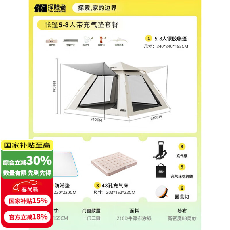 探险者(TAN XIAN ZHE)帐篷户外露营防雨过夜3人-4人速开便捷天幕二合一黑胶防晒帐篷 帐篷5-8人带充气垫套餐