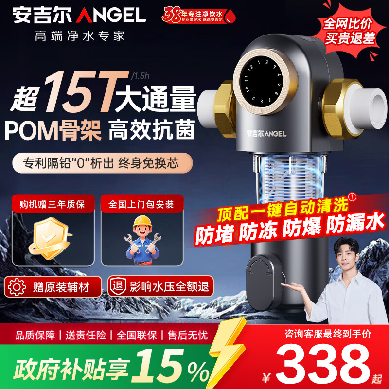 安吉尔15T前置过滤器 净水器全屋中央水驱自旋水盾式涡轮转动反冲洗 自动冲洗刮洗J3524 【超15T大流量】前置过滤器3524