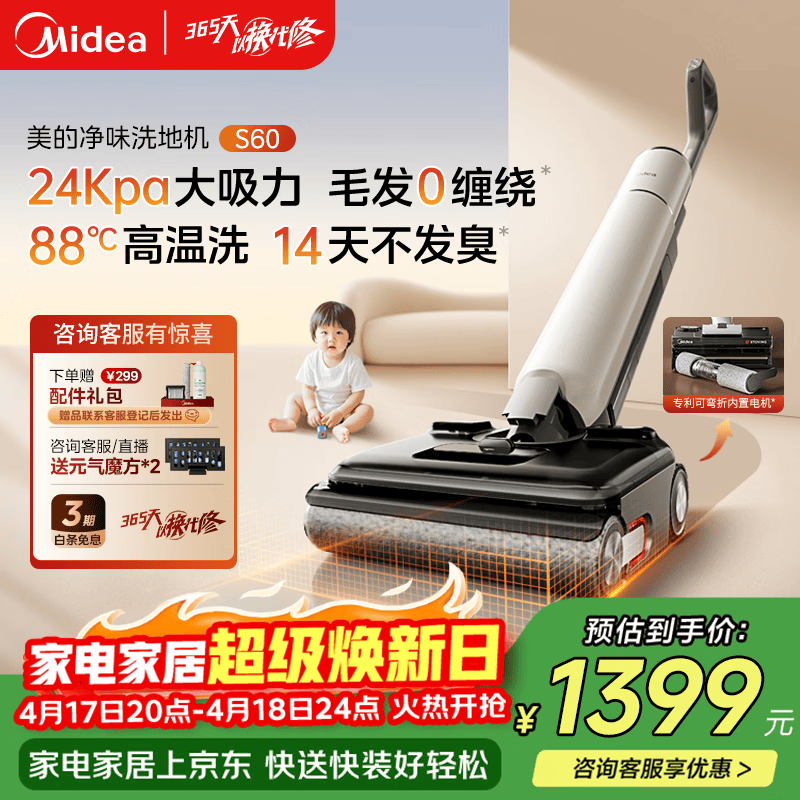 美的(Midea)S60净味洗地机【超薄躺平 24Kpa大吸力 高温自清洁】家用自动清洗吸拖洗一体拖地机扫地机达人同款