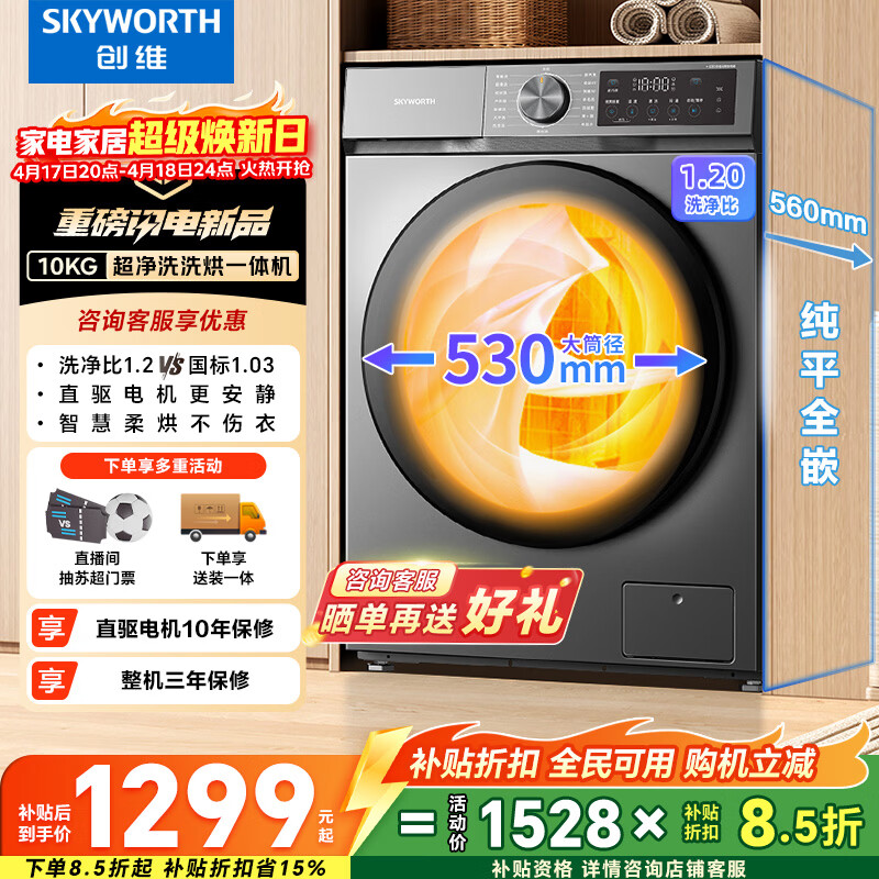 创维变频滚筒洗烘一体10公斤洗衣机全自动家用1.2洗净比带烘干 以旧换新 XQG100-BR3KDH