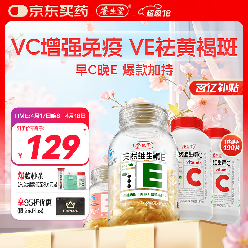 养生堂天然维生素EC组合(VE130粒+VC60片) VC增强免疫力VE美容祛黄褐斑