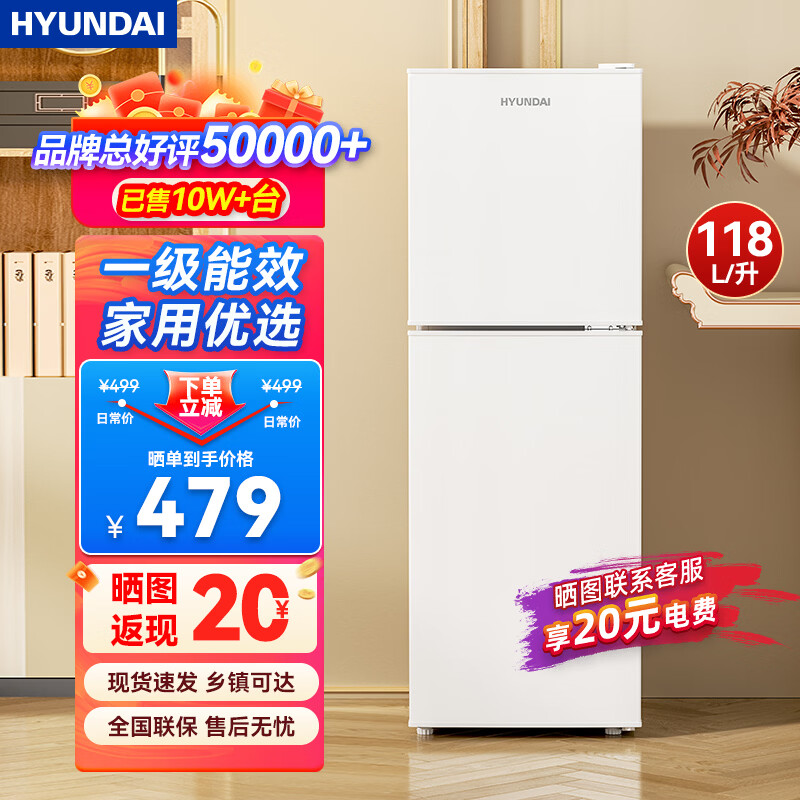 HYUNDAI(韩国现代)小冰箱迷你小型家用冷藏冷冻宿舍出租房办公室双开门二门电冰箱节能省电 118L白【行业热卖+店铺热卖】