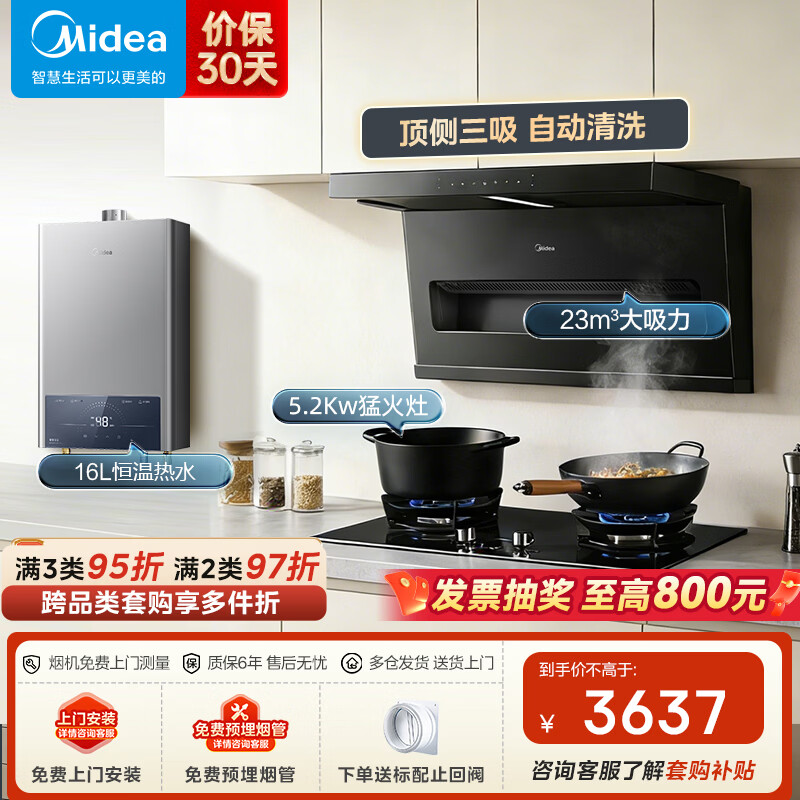 美的(Midea)顶侧三吸油烟机 23立方爆炒大吸力 7字型烟机自动清洗挥手智控家用抽油烟机炉灶燃气灶套装DP55 【烟灶热】配5.2KW灶QD52+16L热水器-天然气
