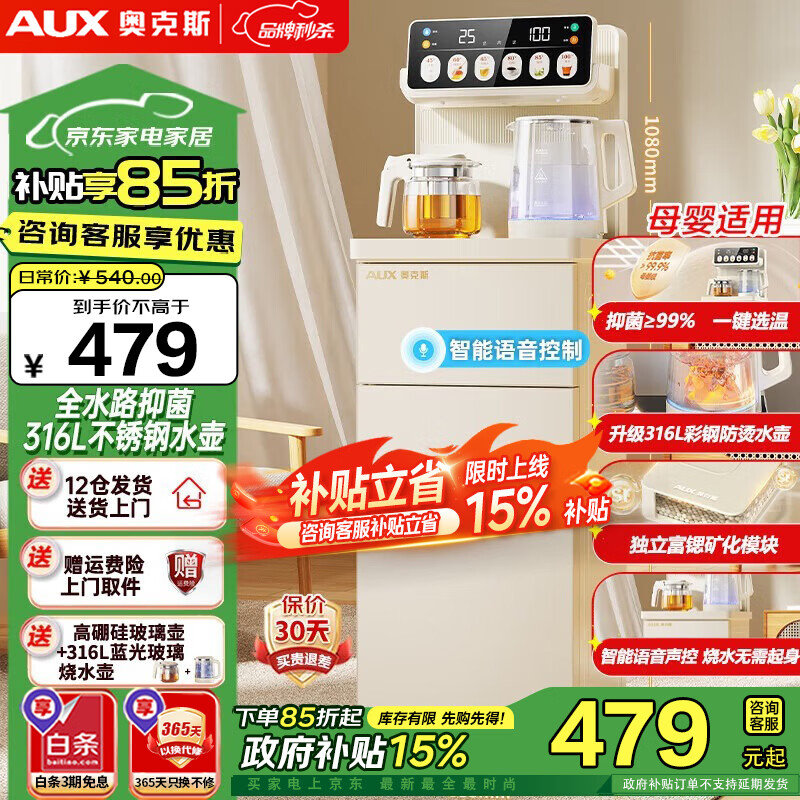 奥克斯(AUX)茶吧机家用多功能智能遥控大屏双显立式下置式饮水机 升级加厚侧板 多档调温 语音遥控丨316L水壶丨抑菌 制冷制热型