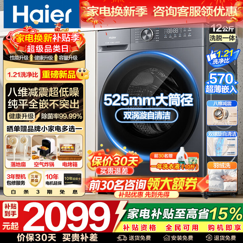 海尔(Haier)洗衣机12公斤【26年新品】滚筒全自动洗衣机大容量洗烘一体除菌省水省电525mm大筒国家补贴统帅 新品12公斤52D+八维减震+525大桶 滚筒单洗