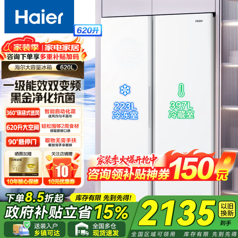 海尔冰箱双开门对开门620升纤薄一级能效双变频风冷无霜大容量节能保鲜家用冰雪白以旧换新家电补贴 620升大容量+黑金净化+90°开门悬停