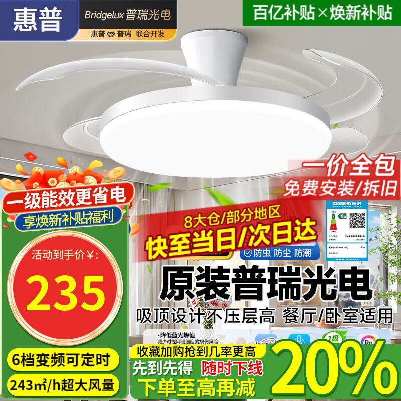 惠普风扇灯普瑞护眼LED隐形扇叶餐厅卧室遥控调光一体无叶吊扇灯中山 1级能效/吸顶42寸普瑞光/遥控无极